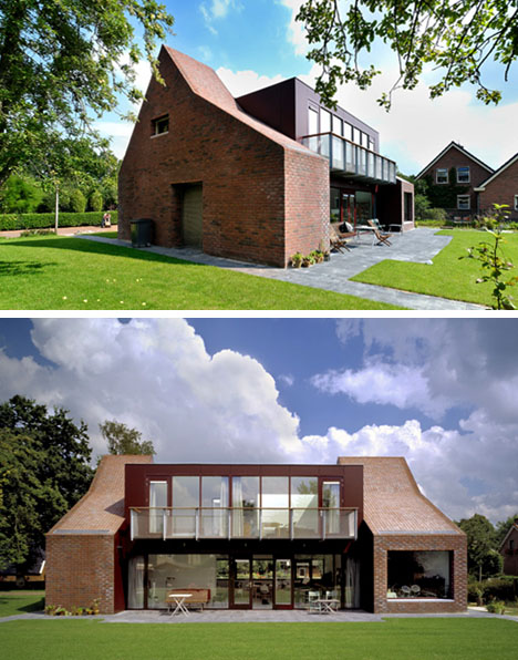 Het bakstenen volume is puur en abstract, oud en modern tegelijk. Vlechtwerk is toegepast om de overgang naar de eveneens bakstenen dakvlakken te perfectioneren. Het metselverband loopt overal consequent door zodat diepte en dikte van de vorm benadrukt worden.