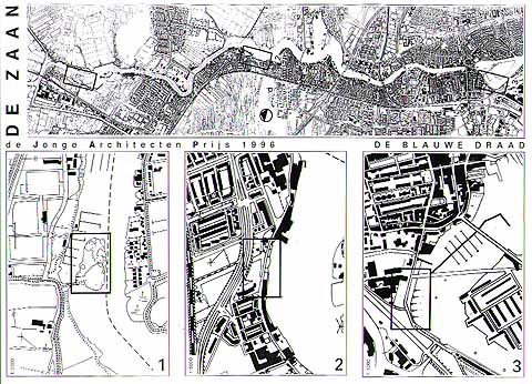 De opgave: De rivier de Zaan is van grote historische betekenis voor Zaanstad. De Zaan vormt een bindend element tussen de verschillende delen waaruit Zaanstad bestaat en het unieke slagenlandschap en heeft als publieke ruimte grote potenties. Het zichtbaar en voelbaar maken van de Zaan als belangrijkste openbare ruimte ('stadspark') is vanwege de beperkte publieke bereikbaarheid en grote lengte problematisch. Daarvoor heeft de projectgroep Zaanoevers een concept ontwikkeld voor het zogenaamde 'Bakenproject'. Door opwaardering van herkenbare (o.a. historische) elementen en door nieuwe toevoegingen kan de Zaan een meer centrale rol gaan spelen in het stedelijke leven. Deze bakens, soms letterlijk, soms abstract, kunnen het bindende karakter van de Zaan versterken, de rivier meetbaar maken en meer interesse wekken voor de Zaan als geheel, zowel vanaf het land als vanaf het water. De deelnemers is gevraagd met een ontwerp voor een object of 'baken' op elk van de drie aangegeven locaties (zie tekening) te reageren op de geschetste problematiek. De jury: De juryleden, Ted van Galen (eerder stedebouwkundige van de gemeente Zaanstad, nu supervisor van de nieuwe wijk Saendelft), Katrien Prak (landschapsarchi- tect), Branimir Medic (winnaar prix de Rome Stedenbouw 1995), Erick de Lyon (beeldend kunstenaar) en de heer D.P. Zwart (directeur Ahold Vastgoed) heeft ieder afzonderlijk de plannen beoordeeld en een schoolcijfer gegeven. Deze punten zijn bij elkaar opgeteld en vormen de einduitslag. De uitslag (achter elk clickable motto zit een pagina met de beelden van elk plan):