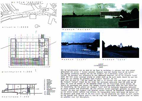 Motto: 'Lucht, horizon, land' Paul Commandeur uit Delft. Hier drie musea, een voor de lucht (onder de grond met alleen uitzicht naar boven), een voor de horizon (opgetild) en een torengebouw (uitkijk) voor het land.