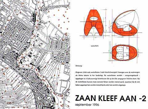 Motto: 'Zaan kleef aan' Winfried van Zeeland uit Amsterdam Ongeveer 2500 rode waterfietsen ('rode bloedlichaampjes') bewegen over de waterwegen als kleine bakens in het landschap.