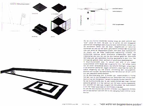 Motto: 'Van water en begaanbare paden' Wim van Hornsveld uit Amsterdam (meer werk van hem in rubriek jong talent). De ontwerper stelt een drietal pieren voor die de Zaan en haar oevers verbinden.1. Een verbinding met het eiland die tevens dienst doet als kano-aanlegplaats. 2. Een met vissersparaplu's voor de hengelaars. 3. Een die een natuur(zwem-)bad omsluit.