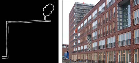 Gerenstein Amsterdam Een groot bouwblok in Amsterdam-Zuidoost, met het thuiskomen via royale entrees en binnenruimten in de vorm van opgetilde buurtjes, het alternatief voor entrees met bellenborden, kil betegelde lifthallen en lange betonnen galerijen. Een oud-directeur van de Amsterdamse kunstacademie vertelde ons over een project waarbij hij kinderen hun eigen huis liet tekenen. Een van hen, een meisje met lange zwarte vlechten uit een Bijlmerflat, tekende de galerij, de lift en de centrale hal als onlosmakelijk deel van haar woning: "ons huis heeft een hal, dit is de lift, dat de galerij met onze voordeur en we hebben een grote schoorsteen op het dak". Thuiskomen via de collectieve ruimten hoort wezenlijk bij de beleving van haar huis: dat besef hebben we tot leitmotief van ons ontwerp gemaakt.