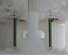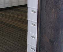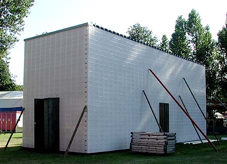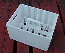 Links de bouwsteen: het niet gekleurde bierkratje van Wavin, rechts een kijkje in een van de muurkratten waarin de vertikale draadeinden te zien zijn die de kratten bijelkaar houden.