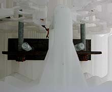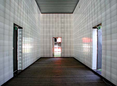 Links het aanzicht van de muur bij een van de deuropeningen en rechts weer een inkijk in een van de kratten waarin de horizontale en vertikale verbindingen bijelkaar komen.