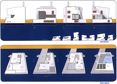 Our contemporary house 'Archimedes' is therefore a floating house, capable of surviving any sea level rise. It could be produced In shipyards, which is a highly developed and innovative Dutch industry. The materials and building techniques are derived from the process of handling thick steel (8-20mm), resulting in strongly sculptural shapes and silhouets.