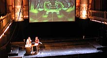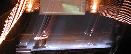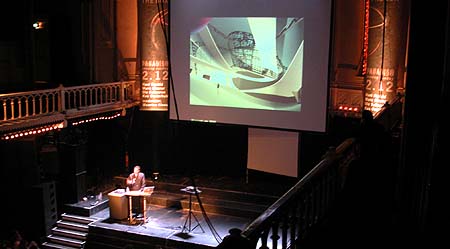 Nicole en Marc Maurer [MUA - zie foto boven] waren de laatste sprekers voor de pauze. Zij werken samen met grafitti kunstenaars, deejays en v-jays en skaters en voegden de daad bij het woord door afwisselend te spreken met muziek en met videobeelden op de achtergrond. Van de meeste projecten was een video-loop gemaakt en ze zijn ook op hun internetsite gedocumenteerd. Het vrij kritische Paradiso-publiek vroeg zich na afloop af wat de nieuwheidswaarde van hun bijdrage nu eigenlijk was en wie dit nu allemaal betaalde. Het werken met anderen dan alleen architecten is voor het duo echter zo vanzelfsprekend dat ze zichzelf dit soort vragen niet meer stellen; ze winnen grote [geld-]prijzen en werken gewoon door. Zo verkochten ze via inconstruct.com reeds 1500 met gestileerde grafitti geindividualiseerde t-shirts, vooral in Japan. Het wachten is nog slechts op de online verkoop van hun architectonische producten...