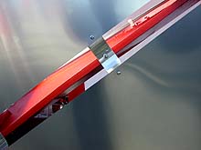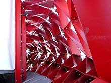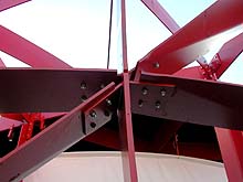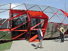 Na de discussie, die nog eens extra inging op de samenwerking tussen architect, constructeur en bouwer mochten we allen aansluiten in de lange file naar het Floriade terrein, alwaar we het paviljoen in levenden lijve konden aanschouwen. Het bezoek was indrukwekkend. De robuuste rood geschilderde constructie viel qua dikte heel erg mee en via de gemonteerde high-lite panelen - een nieuw produkt van sponsor Corus - was de uiteindelijke vorm al goed zichtbaar. Op de onderstaande detailfoto's is te zien hoe de zaken aan elkaar vastzitten. Alles gebout en geschroefd. Eerst in de fabriekshal in elkaar gezet, daarna naar het werk gebracht [100 ton staal] en na de Floriade weer keurig te demonteren en elders opnieuw te plaatsen.