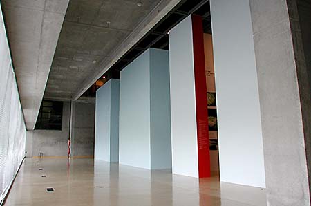Een voordeel van de bijna lege buitenzijdes van de paviljoens is wel dat de ruimtelijke werking van de grote zaal van het NAi - naar ontwerp van Jo Coenen - optimaal zichtbaar en beleefbaar is.