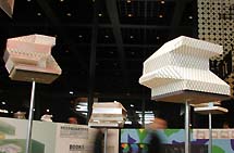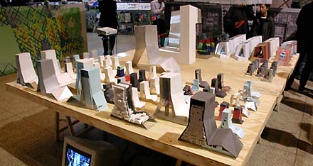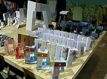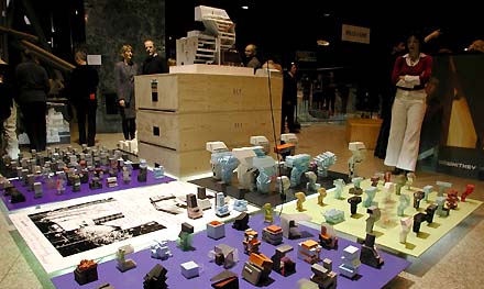 De meeste grote modellen zijn op simpele ondersteuningen boven ooghoogte geplaatst, zodat ze prominent uittorenen boven de project presentatietafels. Hier linksonder de bibliotheek in Seattle en rechtsonder het muziekcentrum in Porto.