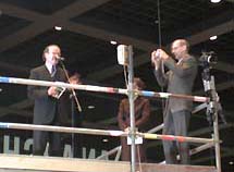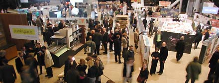 De 2.000 m2 grote expozaal van de Nationalgalerie van de hand van Mies van der Rohe is - ogenschijnlijk rommelig - maar zeer consequent rond de grote ontwerpprojecten ingericht. Bovenstaande foto geeft een overzicht vanaf de steiger die tevens diende om de drie sprekers goed te kunnen zien. Tijdens het openingspraatje van de directeur van de Berlijnse staatsmusea was Rem Koolhaas constant aan het fotograferen; vooral om de vele honderden gasten die ongedwongen tussen de projecten stonden te luisteren, goed vast te leggen [zie foto rechtsonder].