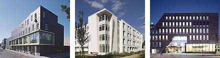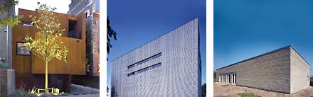 Uiteraard werden er ook gestapelde of in elkaar geschoven doosvormen ingezonden. Zoals linksboven de bibliotheek met woningen van Mas Architectuur in Hengelo, in het midden de stadswoningen van Van Ringen in Groningen en rechtsboven een bedrijfsgebouw van Ruud van de Kroft in Nieuw Vennep. Dat laatste complex is trouwens wel zeer schatplichtig aan het prachtige Kinzo gebouw van Snelder Architecten in Ede [het arrangement is bijna letterlijk vergelijkbaar: kantoor op pootjes boven parkeerdak - met oprit - dat weer bovenop het bedrijfsgedeelte is gelegd...].