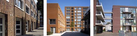 We hebben de 40 nominaties onderstaand voor u thematisch gegroepeerd. Allereerst de rode of bruine baksteen-'dozen'. Hoewel meestal mooi gemaakt en/of mooi gesitueerd of gearrangeerd, voegen ze wat ons betreft niet zoveel toe aan dat wat we al kennen in Nederland. Linksonder woningen van Marlies Rohmer in Den Haag, middenonder woningen van Thijs Asselbergs in IJburg en rechtsonder woningbouw van Bart Duvekot eveneens in Amsterdam.