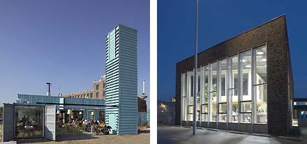 Het Boostergemaal Oost in Amsterdam van Bekkering Adams laat hierboven rechts een volstrekt originele benadering zien voor de omhulling van een strak en saai technisch programma. Met gevels als gevouwen veelvlakken en met misschien wat overdreven uitgewerkte typografische invallen realiseerden zij toch een zeer bijzonder project.