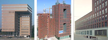 Vervolgens de hoge dozen in rode/bruine baksteen: Van links naar rechtsboven het kantoor van Max van Aerschot in Haarlem, de kantoren en woningen van Atelier Pro en de Architectengroep in Den Haag en woningen van Rapp en Rapp in het centrum van Ypenburg.