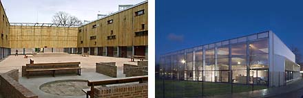 Tenslotte rechtsboven de glazen doos die als kantoor voor architecten Rothuizen van Doorn 't Hooft in Breda functioneert en die boven een bestaande middeleeuwse ruine werd geplaatst en links het bijzondere interieur-doos resultaat van het hergebruik van een modernistische kerkruimte in Lichtenvoorde die nu als binnenplein voor de omliggende nieuwe woningen fungeert, van de hand van Atelier Pro. Helaas biedt de wat magere houten buitenbekleding niet de oorspronkelijke kwaliteit van het kerkinterieur...