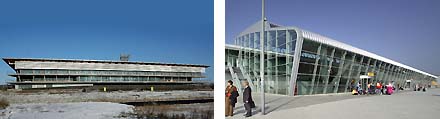 Nog langer: linksboven de afvalzorg in de gemeente Zaanstad van Kerste-Meijer Architecten en rechtsboven de gekromde lange doos op het vliegveld Eindhoven van De Bever, KCAP en NACO.