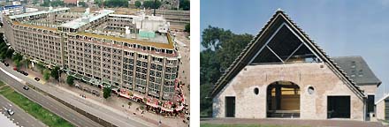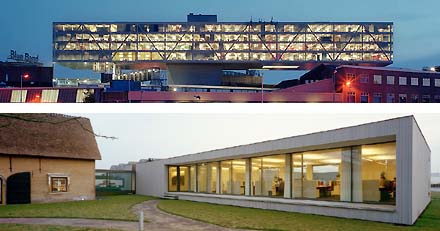 Vervolgens hieronder de bekende opgetilde lange doos voor Unilever in Rotterdam van JHK Architecten [voor de liefhebbers: kijk ook eens naar de vergelijkbare aanpak bij de opgetilde kunstacademie in Toronto van William Alsop...] en daaronder misschien wel de mooiste van deze serie, het kantoor voor Van Aartsenfruit in Breda van Pascal Grosfeld.