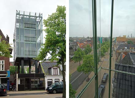 De woning voor Hanna Versteeg en Wouter Hoogland meet globaal 6 x 12 meter en bestaat uit vijf verdiepingen [zie foto linksboven]. Een atelierachtige ruimte op straatniveau met daarin o.a. een paardenbox [zie foto rechtsonder]; de verdieping daarboven is open en wordt ingericht als tuin. De drie bovenste verdiepingen bevatten respectievelijk een eetkeuken, woonkamer, slaapverdieping met op het dak een terras. Het uitzicht is fenomenaal [zie foto rechtsboven]. Uit de paardenbox blijkt al dat er niet echt sprake is van een standaard woonprogramma net zoals de tijdelijke 'voordeur'; een groot motorgestuurd vloerluik. Het gebouw is grotendeels opgebouwd uit glas en staal. De bovenste drie verdiepingen hebben binnen de enkel beglaasde gevel een 'spouw' van ongeveer een meter breed [zie foto linksonder]. Daarbinnen bevindt zich het 'kernhuis', gemaakt met gevels uit leemstuc, mdf-plaat en vouwschuifpuien. Het huis wordt zo duurzaam mogelijk gemaakt [houten balklagen, zonneboiler, opslag/gebruik van regen- en afvalwater voor de daktuin etcetera] zonder te vervallen in de 'geitenwollensokken'-vormgeving die daar vaak bij hoort. De ruimte rond het kernhuis maakt het mogelijk, afhankelijk van het seizoen, de leefruimte te vergroten.