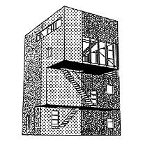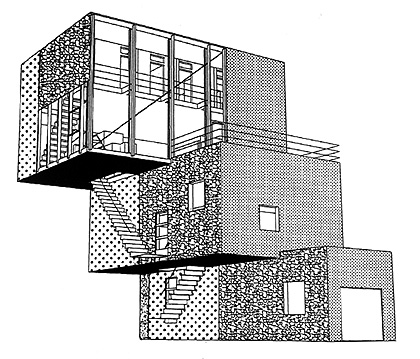De drie volumes representeren - van beneden naar boven - drie onafhankelijke woonfuncties: binnenkomen, werken en wonen. [-] Naast de hoofdtrappen is een informeel trappenhuis aanwezig, evenals een geheime kamer ".