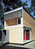 In het kader van een Zwitsers onderzoeks programma naar nieuwe en slimmere toepassingen van houtprodukten [holz 2000] heeft het architectenbureau BauArt uit Bern een zeer eenvoudig prefab woonhuis van zo'n 70- 80 m2 ontworpen. Het is een simpel kleinood geworden. Twee lagen, een doorlopende ruimte, een steektrap, vier ramen en een deur. Het is zelfs gelukt om een ruimtelijke relatie aan te brengen tussen boven en beneden via het doorgetrokken trapgat [met de daarin geplaatste kachel]. Het prototype van de woning is deze zomer gereedgekomen en ziet er zeer veelbelovend uit [zie foto]. Op de speciale site 'smallhouse.ch' zijn alle plattegronden, doorsneden, aanzichten en de exterieur- en interieurfoto's van het prototype te bekijken.