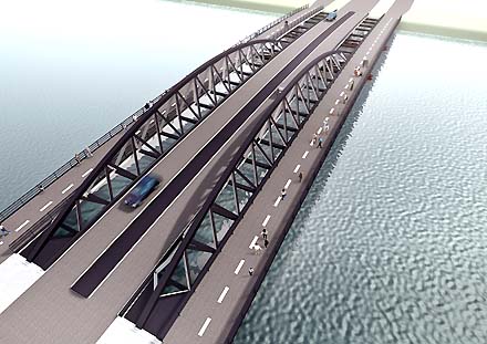 Twee verkeersbruggen in Lijnden, Schiphol Area Development Company naar ontwerp van Khandekar Standsontwerp en Landschapsarchitectuur - Hangtrogbrug Terneuzen, NV Westerscheldetunnel