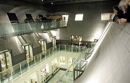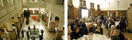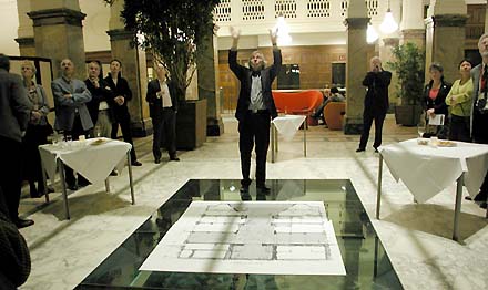 * Haags architectuur seizoen opent in bijzonder gebouw Gisteren vond in het gerenoveerde gebouw van de Raad voor de Rechtspraak aan de Kneuterdijk de traditionele opening van het Haagse architectuur seizoen plaats. De geslaagde avond begon met een toelichting van architect Marc van Roosmalen [zie foto hierboven] op de eenvoudige maar spectaculair uitwerkende ingrepen in het neo-renaissance gebouw van de hand van de gebroeders van Nieuwkerken uit 1920. Aan de hand van de doorsnede van het oorspronkelijke bankgebouw was dat het duidelijkst uit te leggen: de kelders met de enorme kluizen en de monumentale begane grond als vergaderruimten en de kantoorruimten op de etages, waarbij het overkappen van de ruimte tussen de daken een zeer bijzondere atriumruimte heeft opgeleverd [zie foto hieronder]. En via glazen vloeren is alles ook nog eens ruimtelijk met elkaar verbonden. Na de uitgebreide rondleidingen begon voor de ruim 120 aanwezigen het ook alweer traditionele diner met als intermezzi dit maal een kennismaking met de nieuwe BNA-voorzitter Jeroen van Schooten en spoorbouwmeester Nathalie de Vries. Niet nadat het boekje met verslag van de vorige jaaropening door mede-organisator Terry van der Heide was uitgereikt aan de Haagse wethouder Norder. Van Schooten stal de harten van de aanwezigen met een kort en krachtig betoog : we moeten beter, completer en professioneler worden, we moeten de beste mensen aan ons zien te binden en ze dan ook goed betalen en we moeten vooral innovatiever worden, dan wordt het vak vanzelf aantrekkelijker... Nathalie de Vries stelde enigszins teleur met een vrij omslachtige 'inkijk' in haar werk als bouwmeester van de NS. Ze besprak de problematiek van het stationsgebouw en de uitgebreide procedures bij totstandkoming, onder meer aan de hand van de nieuwe HSL-stations in de grote steden. Het enige verrassende bleek haar opbloeiende liefde voor oudere stations zoals dat van Zutphen, in de wederopbouw periode gebouwd naar ontwerp van architect Schelling.