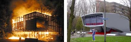 * Rotterdam doet 3e Arch-Biennale gewoon zelf Het is alweer even geleden, maar nadat het Stylos paviljoen Scaffold was afgebrand [zie foto links] is er een prijsvraag onder bouwkundestudenten uitgeschreven voor het ontwerp van een nieuw paviljoen. Op 15 december 2005 werden door de jury, bestaande uit Mick Eekhout, Jo Soeter, Bob van Reeth, Jo Coenen , Kees Kaan en mevrouw A. Klinkhamer van de afdeling Vastgoed van de TU Delft, de vijf genomineerde plannen bekendgemaakt. Tevens werd een zesde plan via de publieksprijs toegevoegd. Deze zes ontwerpen worden nu nader technisch en financieel uitgewerkt en in week 8 kiest de jury het plan dat gebouwd gaat worden.