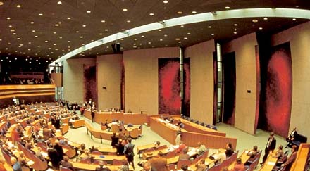 Afgelopen dinsdag overleed in Den Helder een groot kunstenaar. Hij maakte onder meer monumentale wandschilderingen in het kader van de percentageregeling beeldende kunst, zoals de prachtige vervagende cirkels in het Amsterdamse gerechtsgebouw en de panelen aan de korte zijde van de vergaderzaal van de Tweede Kamer [zie foto onder]. Sinds 1980 werkte hij aan zijn grote en integrale kunstproject 'De Nollen' in de duinen bij zijn woonplaats. Hij transformeerde daar een binnenduingebied met verspreide bunkers tot een nieuwe belevingswereld, waar hij experimenteerde met licht, ruimte, schaal en maat. Hij realiseerde er verschillende eigen bouwsels in cortenstaal en riet, zoals op de onderstaande foto het 'Eidilon', een zeven meter hoge stalen kelk. Het project verwierf internationale bekendheid en Van de Wint ontving een grote Europese subsidie voor een ongestoorde voortgang.