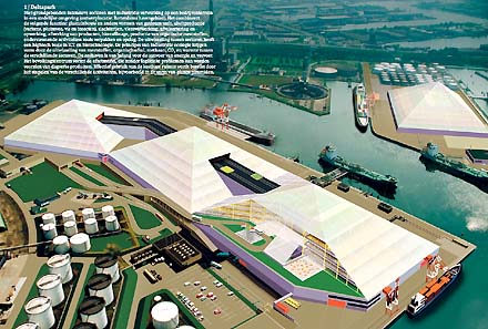 Dat blijkt uit een onderzoek van Landbouw Universiteit Wageningen, dat mede in opdracht van het havenbedrijf is opgesteld. De varkensfabriek moet minstens twintig hectare groot worden en honderd- tot driehonderdduizend slachtvarkens huisvesten op diverse verdiepingen. Op ons netvlies staat natuurlijk nog het eerste spectaculaire voorbeeld onder de naam 'PigCity', een studie uit 2001 van de hand van MVRDV [zie foto hieronder].