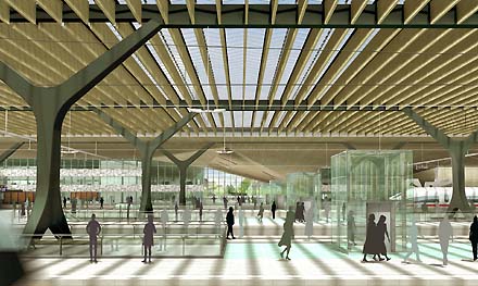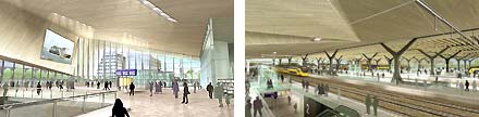We zien een overzichtelijk ontwerp dat voorzien is van veel glas voor de directe daglichttoetreding - op alle plaatsen in het complex - en vooral de toepassing van houten plafonds, zowel in de grote stationshal als boven de perrons. Opvallend is de asymmetrische hoofdentree aan het Kruisplein [zie impressie boven], waarbij we zelfs even moesten denken aan het zojuist opgeleverde Denver Art Museum van Daniel Libeskind, maar ook de prikkelende beelden van Zaha Hadid schoten door ons hoofd; het geeft aan dat deze oer-Hollandse architecten weldegelijk ook 'kinderen van hun eigen tijd' zijn...