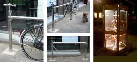 Afgelopen vrijdag werden in Eindhoven de Nederlandse Designprijzen 2006 uitgereikt. In aanwezigheid van Staatssecretaris van EZ Karien van Gennip, de burgemeester van Eindhoven en lijsttrekker Jan Marijnissen van de SP [in de categorie huisstijl won de huisstijl voor de SP naar ontwerp van Thonik] kregen de winnende ontwerpers vanuit de 14 categorieen hun welverdiende prijs. De meer architectonische onderdelen tonen we hier, zoals de zoveelste prijs voor ONL [Kas Ooosterhuis en Ilona Lenard] voor het 'ontwerp van de openbare ruimte' met het Barrier-gebouw voor autobedrijf Hessing langs de A2 [zie foto boven] en in de categorie 'product voor de openbare ruimte' de prijs voor het prachtige HEKLUCHT - een oversized fietspomp gecombineerd met een roestvast stalen parkeerbeugel - van de hand van Jeroen Bruls en Krijn Christiaansen [ze vormen samen designstudio Hi Mom - zie foto's hieronder links en midden]. Eerder maakten ze van telefooncellen een etalageproject voor de producten van de kunstacademie in Groningen [zie foto rechtsonder].