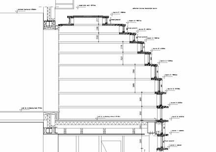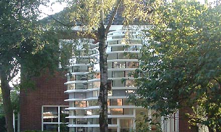 Vooral de combinatie van het bijzondere ruimtelijke beeld en de eenvoud van de opbouw spreekt ons aan. Met horizontale gebogen lamellen en vertikale stroken glas [zie detailtekening hierboven] wordt een sprankelende en levendige buitenvorm samengesteld, die ook voor het interieur een verrassende ruimtelijkheid tot gevolg heeft.