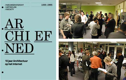 Vervolgens gingen we onderweg naar het Groothandelsgebouw waar ArchiNed het 10 jarig bestaan vierde met een informele borrel en een publicatie [zie foto kaft linksboven]. Het 'ArchiNed Archief' beschrijft de geschiedenis van Neerlands oudste internet-platform met architectuur als onderwerp. Per jaar een overzicht van de belangrijkste artikelen en nieuws-items en een overzicht van de populaire Society-rubriek.