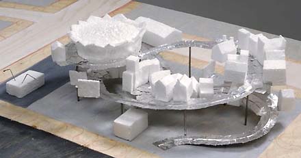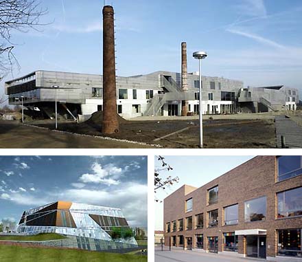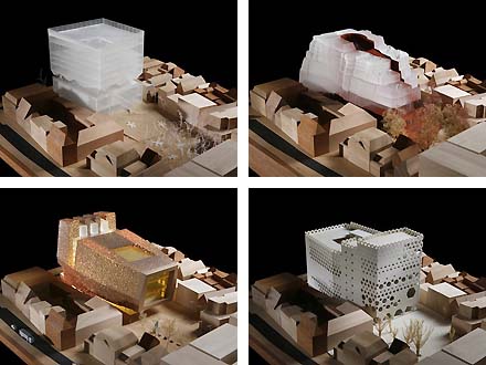 Tenslotte hieronder de overige vier: linksboven Wiel Arets, rechtsboven Erick van Egeraat, linksonder Neutelings Riedijk zelve en rechtsonder Foreign Office Architects [met Arets het enige plan waarvan de gevels nog gewoon in het lood staan, haha...].