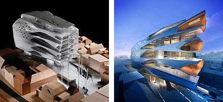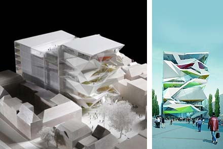 Gisteren werden de zeven ontwerpen voor het culturele centrum Forum in Groningen gepresenteerd. Het aan de Nieuwe Markt te bouwen complex is een uitwerking van het door Neutelings Riedijk ontworpen stedebouwkundige plan. De Groningers zelf mogen straks stemmen over het te bouwen ontwerp. Hierboven het plan van Zaha Hadid, onderstaand achtereenvolgens de ontwerpen van NL Architects en UN Studio.