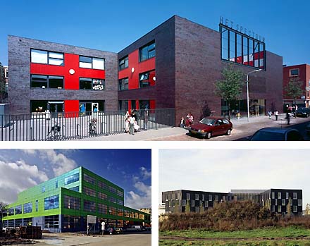 De drie scholen hierboven: bovenaan OBS Het Spectrum in Den Haag van Marlies Rohmer, linksonder OBS de Globe-Johannesschool in Amsterdam van Atelier Zeinstra van der Pol en rechts de Sportcampus Leidse Rijn in Utrecht van Wiel Arets.