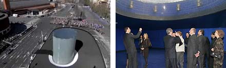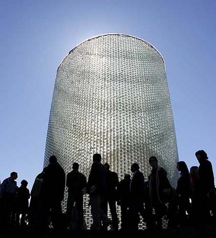 Naast het station Atocha [van Raphael Moneo] in Madrid is gisteren tijdens een sobere plechtigheid in aanwezigheid van de Spaanse koning en koningin het monument voor de 191 slachtoffers van de bomaanslagen op 11 maart 2004 onthuld. Het bestaat uit een 11 meter hoge, cirkelvormige constructie van glazen bouwstenen, boven een ondergronds stiltecentrum, dat bereikbaar is vanuit het station. Aan de binnenzijde van de glazen cilinder zijn teksten opgenomen uit de geschreven hartekreten die op de dagen na de aanslagen bij het station op briefjes zijn achtergelaten. Op de foto links een bovenaanzicht van het monument, rechts het koninklijke gezelschap in de stilteruimte, linksonder een blik vanuit de stilteruimte naar boven, rechtsonder een exemplaar van de speciale glazen bouwsteen waaruit de cilinder is opgebouwd.