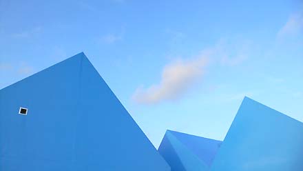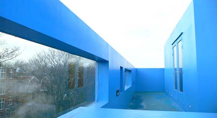 Een drietal archetypische slaaphuisjes staat schijnbaar lukraak op het dak, een halfhoge muur er omheen. Twee picknicktafels maken het tafereel compleet: we hebben hier met een of ander kampement van doen. Alleen is hier alles blauw: de huisjes, de vloer, de picknicktafels, de vazen en zelfs de gieter. Alles blauw.