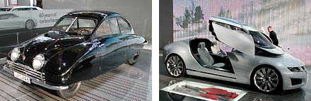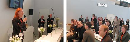 Vanmorgen waren we aanwezig bij een bijzondere presentatie op de persdag van de AutoRai. Readershouse/Hearst nam samen met autoabrikant Saab het initiatief voor een nieuw internetportal genaamd 'Independent Minds' [IM] dat zich richt op de onafhankelijke geesten in ons land. De doelgroep is geinteresseerd in cultuur, business en creativiteit en koopt hopelijk ook wel eens een auto - en dan natuurlijk liefst een Saab... Op de stand de eerste Saab uit 1947 en de meest recente innovatieve conceptcar met 400 pk Biopower motor [zie foto's boven]. Na korte inleidingen van de Saab-directie en de nieuwe hoofdredacteur van IM, kwam designer Pieke Bergmans [zie foto hieronder] aan het woord die iets vertelde over haar ontwerpmethode en de zogenaamde 'Design Virus' resultaten, waarover ze op de nieuwe internetsite werd geinterviewd.