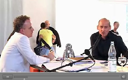 De groeiende bandbreedte op internet maakt het steeds eenvoudiger om ook bewegend beeld van lezingen en interviews op te nemen in websites. We kwamen er de afgelopen maanden een paar zeer interessante voorbeelden van tegen. Na hun eerste 24-uurs interviewmarathon vanuit de Serpentine Gallery in de zomer van 2006 hebben architect Rem Koolhaas en Serpentine curator Hans Ulrich Obrist deze succesvolle formule opnieuw gehanteerd op de actuele Documenta in Kassel [zie foto]. Daar interviewden ze zo'n 24 kunstenaars, beschouwers en architecten in een korter durende marathon van een kleine 10 uur. Het aardige is dat ArchPlus deze interviews heeft vastgelegd en ze in videoformaat toegankelijk heeft gemaakt. Uiterst interessant om Rem Koolhaas - voornamelijk in het Duits - een zeer breed scala aan onderwerpen te zien en horen bespreken met prominente Duitsers zoals onder meer de architecten Boehm en Schulze-Fielitz. Vooral de beeldkwaliteit is uitstekend te noemen. [Naschrift 21 augustus: per dag worden er video's toegevoegd. De gesprekken met de architecten Juergen Mayer H. en Guenther Zamp Kelp - van voormalig Haus Ruecker en Co - staan er inmiddels op en zijn aanraders!]. Verder vonden we op de website van voormalig OMA-medewerker Joshua Prince Ramus twee interessante lezingen, onder meer over ontwerp en bouw van de Seattle Library. Hij blijkt een begenadigd spreker te zijn en vertelt in een tweetal gestreamde congresbijdragen zeer helder en uiterst onderhoudend over de positie van de architect. Tenslotte het interessante verslag van een discussie in New York over het werk van drie ontwerpers - waaronder de Nederlander Tejo Remy - die onder meer gebruik maken van recycled materiaal bij hun producties. Het wordt misschien tijd om de leerzame lezingen en discussies te gaan listen op k+NAP, ze bieden tenslotte kennis uit de 'eerste hand'. We zijn dan ook benieuwd naar goede voorbeelden die we nog niet kennen, maar die u zelf bent tegengekomen...
