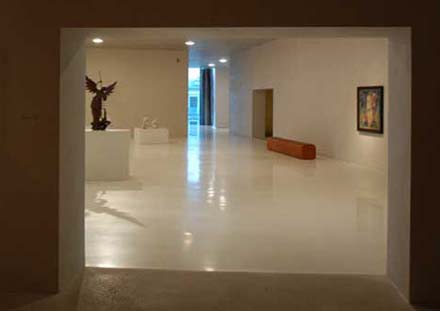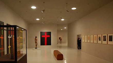 Boven deze hal is het eigenlijke museum gesitueerd. De collectie beslaat tien eeuwen maar de nadruk ligt op modern werk waaronder een serie bijzondere Warhols en Chillida's. De route door het gebouw slingert omhoog met af en toe een kolossaal verdiepinghoog raam, dat eigenlijk nooit een rechtstreeks uitzicht heeft.