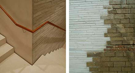 Zumthor wilde het tegendeel van het Bilbao-effect bereiken met dit gebouw en dat blijkt goed gelukt te zijn. Het forse gebouw plooit zich in de bestaande stad met gevelmateriaal dat nauwelijks lijkt op te vallen. De entree ligt in een onbeduidend straatje [zie bovenste beeld]. Bij nader inzien blijkt het gevelmateriaal - metselwerk - toch wel bijzonder te zijn, een speciaal gemaakte dunne zandkleurige baksteen, eigelijk meer een tegel, 36mm dik maar uitzonderlijk lang [de lengte varieert overigens]. De wanden zijn opgebouwd uit 6o cm [!] dik en massief dragend metselwerk geïnspireerd op Romaanse muren [zie beeld hierboven rechts].