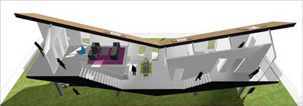 Ons 'eigen' MVRDV werd eveneens gevraagd mee te doen; ook hier doen ze hun innovatieve en soms dwarse reputatie weer eer aan met een sterk afwijkend ontwerp: het leverde een vreemde - en symbolisch? - geknikte woning met interne niveauverschillen op [zie beelden hierboven].