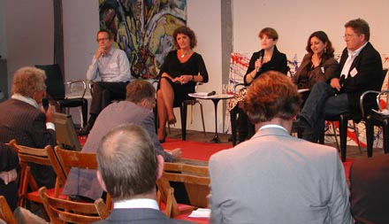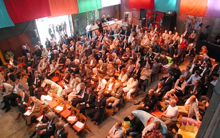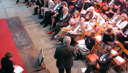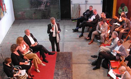 Guachati en Maarten Kloos] zorgde Harmke er regelmatig voor dat Felder zelf aan de discussie meedeed. Die afwisseling van film, podiumdebat en inhoudelijke interventies van Fer uit de zaal droeg zeker bij aan de kwaliteit van de middag. Op ontspannen wijze werden de toehoorders zo warm gemaakt voor een meer betrokken aanpak van het stedelijke woningvraagstuk. De twee blokken na de pauze gingen vooral over de bijzondere kwaliteiten van de stad, uiteraard met de nadruk op de recente voorbeelden uit Amsterdam, en over de toekomst van corporatieland. Want niet voor niets droeg het symposium de prikkelende titel 'Corporaties de redder van Nederland, hoezo?' Tijdens het laatste deel schoof ook de enigszins verlaat aangekomen minister Eberhard van der Laan aan, hetgeen de sfeer van de discussie niet echt positief beinvloedde... De stellingen werden mede op zijn aanwezigheid afgestemd met pleidooien voor meer geld, al was het maar voor de culturele broedplaats waar we te gast waren, de NDSM-werf. Maar van der Laan kwam nog wel met enkele nieuwe initiatieven, zoals een nota van 'slechts 39 pagina's' over een strakkere aanpak van corporatieland, die op de vrijdag daarna inderdaad door het kabinet werd aanvaard. De waardevolle middag besloot met een dankwoord van Fer Felder zelf [zie foto hierboven] en een afsluitend persoonlijk woord van de minister, die Fer een ministerieel adviseurschap aanbood voor de komende maanden [zie beeld hier direct boven]. Kortom, een waardig inhoudelijk afscheid voor een cultureel geïnspireerd opdrachtgever met het hart op de goede plaats, of beter gezegd met het hart op meerdere goede plaatsen - denk dan ook aan zijn grote liefde voor architectuur en kwaliteit! [Wij van de BOX kennen Fer Felder al uit begin jaren negentig van de vorige eeuw als de enthousiaste en eerste professionele opdrachtgever van het Jonge Architecten Atelier, maar ook als actief bestuurslid van de Utrechtse Rietveldprijs. Laatstelijk was hij betrokken als jurylid bij de 'Architect van het Jaar' Prijs 2007. Vanzelfsprekend wensen wij hem, zijn vrouw Anneke en hun beide dochters alle goeds toe.] - 14 juni 2009 - BOX 1.456