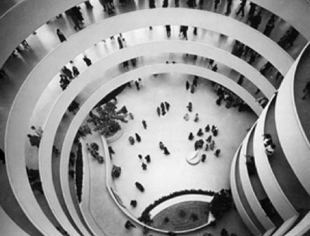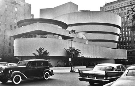Het beroemde Guggenheim Museum in New York werd precies 50 jaar geleden geopend. De architect Frank Lloyd Wright, die de oplevering van het gebouw niet meer mee heeft kunnen maken, wordt deze maanden geeerd met een overzichtsexpositie van zijn complete oeuvre. Boven is een foto te zien uit 1959, direct daaronder de actuele toestand na de laatste restauratie en met de als decor fungerende nieuwbouw naar ontwerp van architectenbureau Gwathmey Siegel Associates. In de vele artikelen [zie hier de New Yorker en de NY Times] die rond het 50-jarig bestaan verschenen, wordt - naast de grote bewondering voor het unieke gebouw - ook telkens de spanning tussen het spiraalvormige museumconcept en de te exposeren kunst genoemd. Waar beeldhouwwerken en werken van enig formaat het in deze ruimte zeer goed doen, blijkt het gebouw minder geschikt te zijn voor exposities van vooral kleinere schilderijen. Die kunnen vaak niet opboksen tegen de overweldigende ruimte. In de actuele expositie - mede samengesteld door de Nederlandse assistent curator architectuur en design David van der Leer - zijn de originele tekeningen van Wright dan ook niet direct aan de wanden gehangen, maar in losse glazen vitrines opgenomen. Op de website van de NOS is een interview met David geplaatst, en een aantal beelden uit de FLW-expositie. [Voor onze vaste lezers bovenstaand nog een onverwachte 'nauwe verwant', het interieur van Guggenheim naast de hal van een van de FroSilo's van MVRDV in Kopenhagen.] - 04/08 juni 2009 - BOX 1.454/NY Times