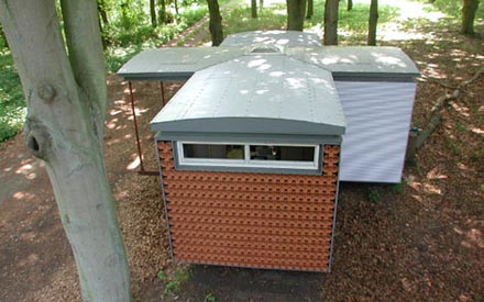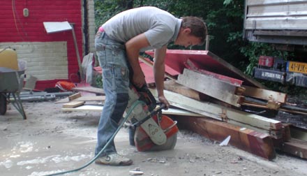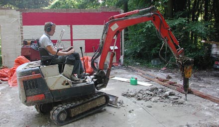 De afgelopen week zijn de eerste stappen gezet op weg naar de vernieuwing van het kantoor van ArchitectenWerk in de duinen van Wassenaar. Na 25 jaar opereren vanuit ons bescheiden voormalige kantinegebouwtje, wordt de bestaande opstal daarvan grotendeels gesloopt. Waarna een uitbreiding aan voor- en achterzijde wordt gerealiseerd en een etage toegevoegd. Op de foto's boven zijn de sloopwerkzaamheden - hier het inzagen en slopen van een deel van de bestaande betonvloer - te zien, die uiterst professioneel worden uitgevoerd door de firma Hogenhout uit Amsterdam/Sloten. Tijdens de bouwwerkzaamheden die een klein jaar gaan duren, werken we vanuit onze tijdelijke huisvesting naast de bouwplaats in een omgebouwde scheepscontainer. Hier de buitenzijde en de werkplek van uw trouwe BOX-redactie. [Graag bevelen wij vader en zonen Hogenhout bij u aan voor uw mogelijke sloop- en grondwerk. U kunt ze voor nadere informatie bereiken via e-mail h.hogenhout@kpnmail.nl.] - 18 juni 2009 - BOX 1.457