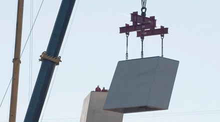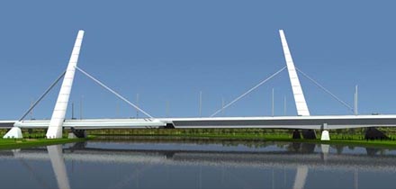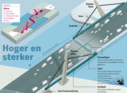 De A1-weggebruikers zien het al een aantal weken groeien, het nieuwe Muiderbrug project naar ontwerp van Benthem Crouwel Architecten. De bestaande stalen brug wordt versterkt, verbreed en verhoogd, mede om de containervaart beter te kunnen faciliteren. CoBouw maakte een aardige illustratie van de aanpak [zie beeld hieronder]: naast de brug komen twee betonnen pylonen met zware stalen drukbalken aan de zijkant van de brug die via tuikabels worden gedragen. Die twee balken worden centraal met elkaar verbonden door een 210 ton zware opvangligger. Aan één zijde van de brug wordt tenslotte nog een fietspad toegevoegd. Naast het heldere ontwerp dwingt ook de logistiek respect af. Zonder dat het verkeer er noemenswaardig last van heeft gehad is de brug al eerder enige decimeters omhoog gevijzeld. Op dit ogenblijk worden de twee 70 meter hoge pylonen uit geprefabriceerde betonelementen samengesteld [zie foto geheel onder] en de tuien aangebracht. De laatste stap is het verbinden van de balken en het aanspannen van de tuien, waarmee de brug op de nieuwe definitieve hoogte komt de liggen. [In de nacht van zaterdag 20 op zondag 21 juni zal de Muiderbrug geheel afgesloten zijn, dan worden de tuien op spanning gebracht.] - 09 juni 2009 - BOX 1.455/CoBouw