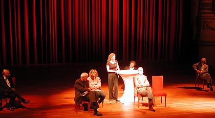 De protagonisten van de middag waren bij aanvang verspreid geplaceerd op de vergrote podiumvloer van de grote zaal en trokken na hun gesproken bijdrage [we moesten het helaas zonder beeld doen] stapsgewijs naar het centrum van het speelvlak. Het was leuk om te zien dat beide partners van Benthem Crouwel Architects zich deze middag - wellicht onbedoeld - visueel presenteerden als de eigentijdse versie van Jansen & Janssen via hun beider spierwitte shirt [met bovenste knoopje los], hun identieke lichtgrijze pak en hun halfhoge brown suede shoes...
