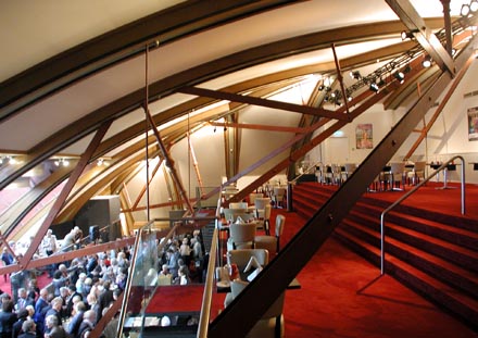 Bij de afsluitende borrel in de ruime bovenfoyer onder de kapspanten kwam in het praatje van hoogleraar Vincent van Rossem de aap uit de mouw: 'We vinden de 19e eeuw gewoon lelijk! we kunnen het niet echt verteren. Het begrijpen van die periode en de 'kermisachtige wansmaak' die daarbij hoort zullen we langzaam moeten leren, betoogde hij tenslotte. Wij menen dat het enigszins matte - maar toch onderhoudende - debat, samen met deze goed gevulde Open Monumentendag aan dat betere begrip ditmaal zeker heeft bijdragen.