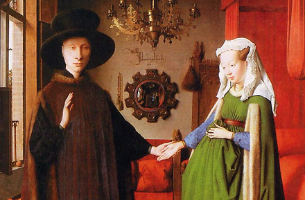 En waar Van Warmerdam verwees naar een gebouw, besloot Riedijk in zijn dank, met name naar de opdrachtgevers met de verwijzing naar een schilderij, dat van het echtpaar Arnolfini van de hand van de Vlaamse schilder Jan van Eijck uit de 15e eeuw [zie uitsnede hierboven]. Zoals in het beeld van Ptolemeus - met als kern natuurlijk in dit geval de architecten zelf - is in dit prachtige middeleeuwse schilderij de schilder zelf nog net te zien in de bolle spiegel op de achtergrond. Als voorbeeld dat de maker juist en vooral in zijn werk immer zichtbaar blijft... Zijn laatste woorden waren dan ook gericht aan die opdrachtgevers voor het in hen als architect gestelde vertrouwen: "Zonder vertrouwen geen gesprek, en zonder gesprek geen architectuur!' [Een interessante bijkomstigheid blijkt na bestudering van het beeld in de spiegel van Van Eijck: daar staan naast het betreffende echtpaar namelijk niet één - dus niet alleen de schilder zelf - maar twee extra personen afgebeeld. Wat ons betreft dus inderdaad een terecht gekozen voorbode van dit illustere architectenduo; daarom ook vanuit De BOX een rechthartelijke felicitatie aan Willem-Jan Neutelings en Michiel Riedijk voor deze zuurverdiende BNA-Kubus voor hun gehele oeuvre!] - 20 november 2010 - BOX 1.535